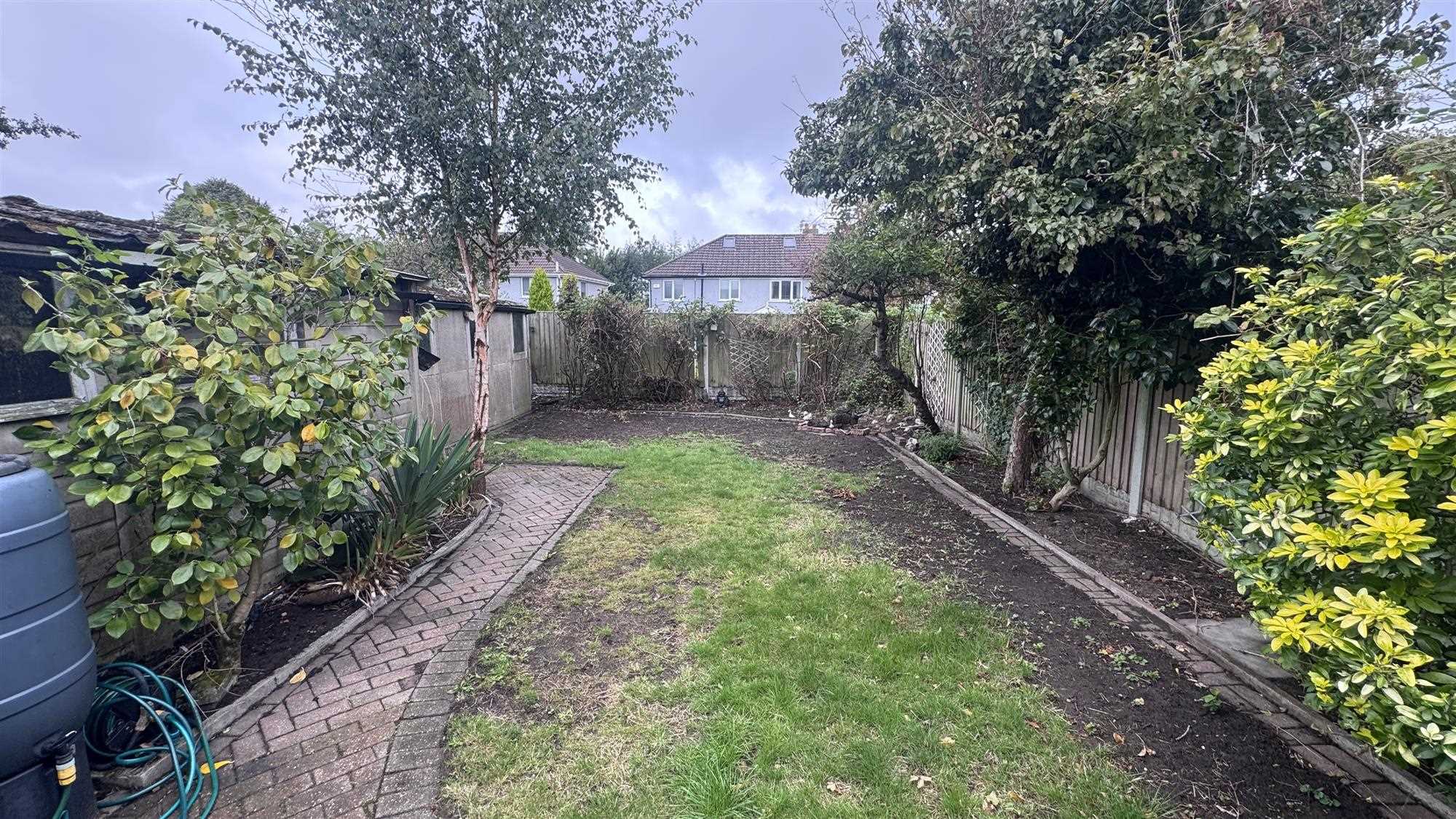 Gated access with fenced boundaries, mature shrub borders and lawn area, paved patio and large storage garden sheds. side access to garage.