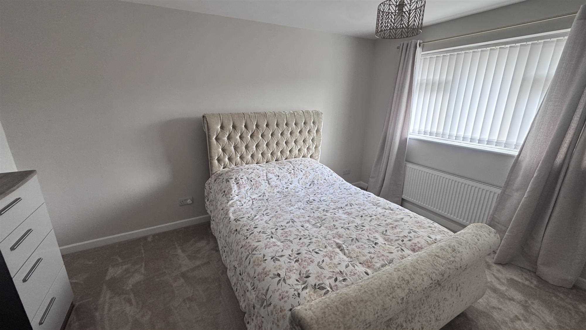 Upvc window to the rear of the property, radiator and carpeted flooring.