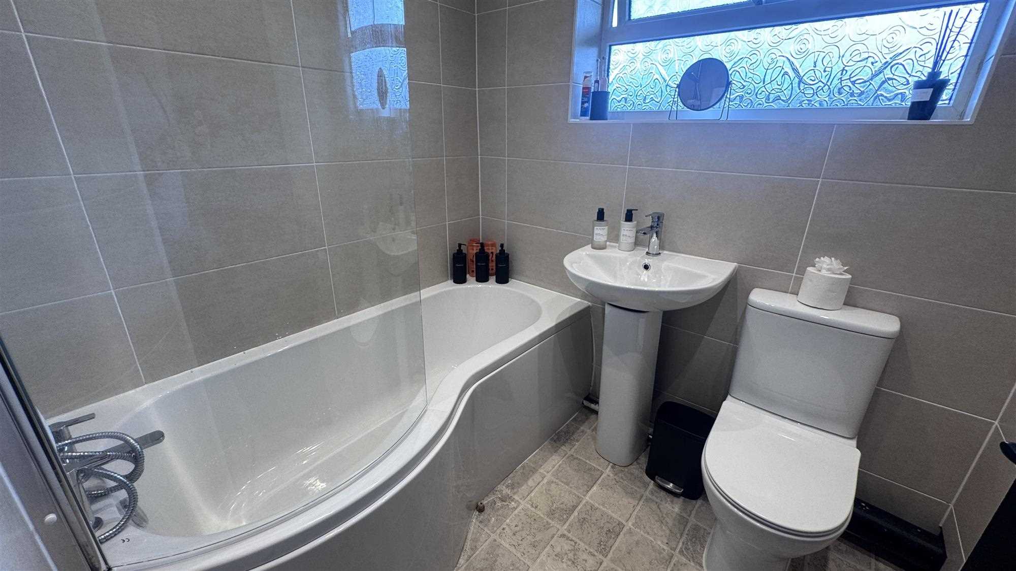 Upvc window to the rear of the property, large "P" shaped bath with overhead shower and screen, low level Wc and pedestalled wash basin, heated towel radiator, spotlights and mechanical ventilation.