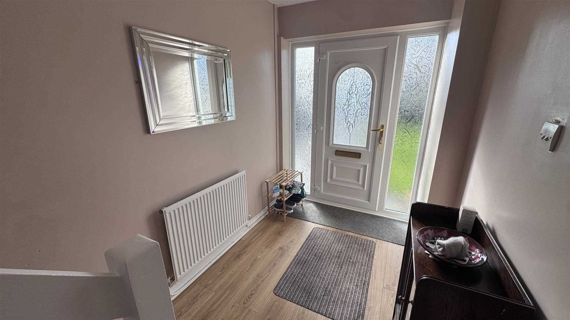 Upvc entrance door, radiator, stairs to first floor and laminate flooring.