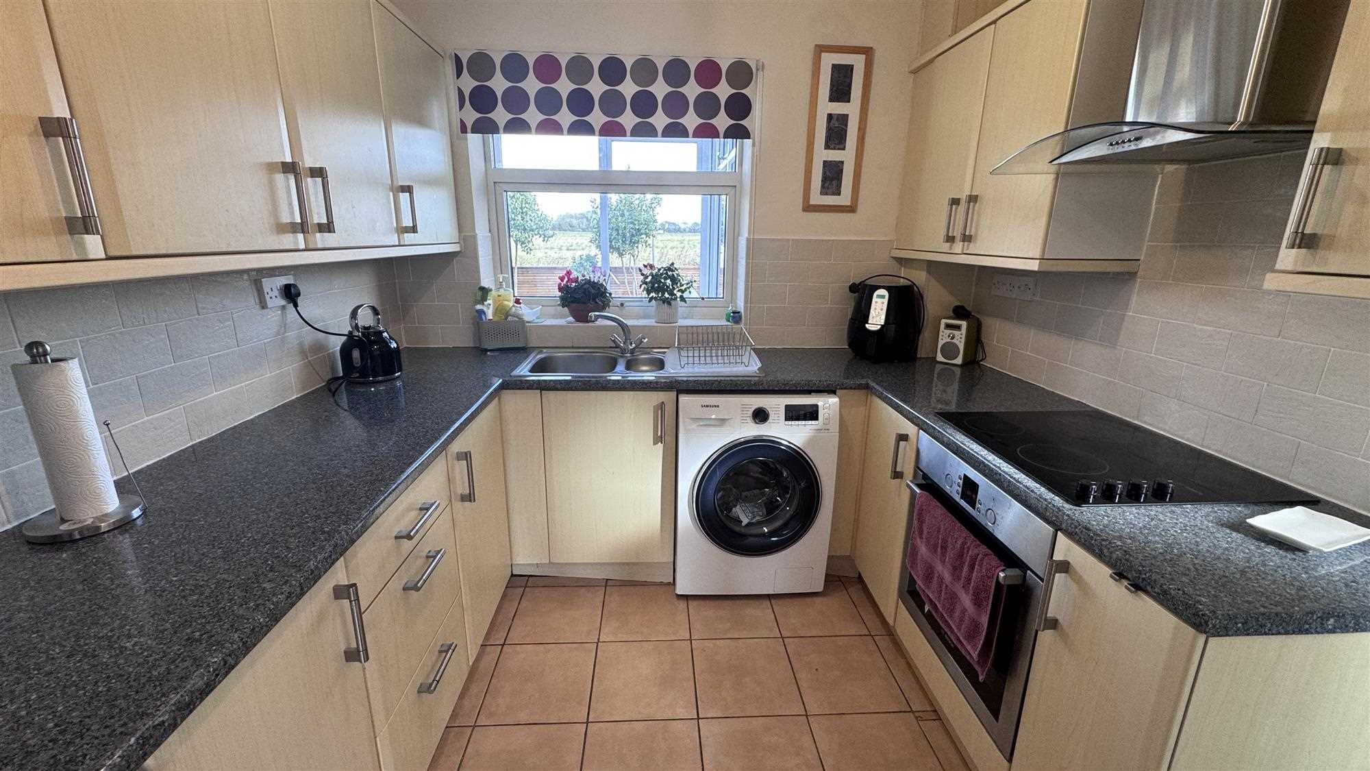 Upvc window to the rear of the property and single door to the side, Light Beech base and wall units with Ebony contrasting worktops, Integrated oven and hob with overhead extractor, plumbed for washing machine, storage cupboard and ceramic flooring.