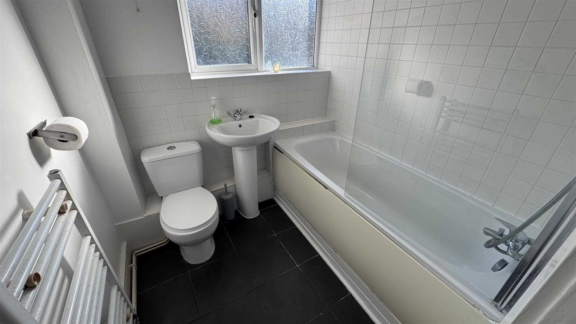 Upvc window to the rear, panelled bath with overhead shower and screen, low level Wc and pedestalled wash basin, heated towel radiator and vinyl flooring.