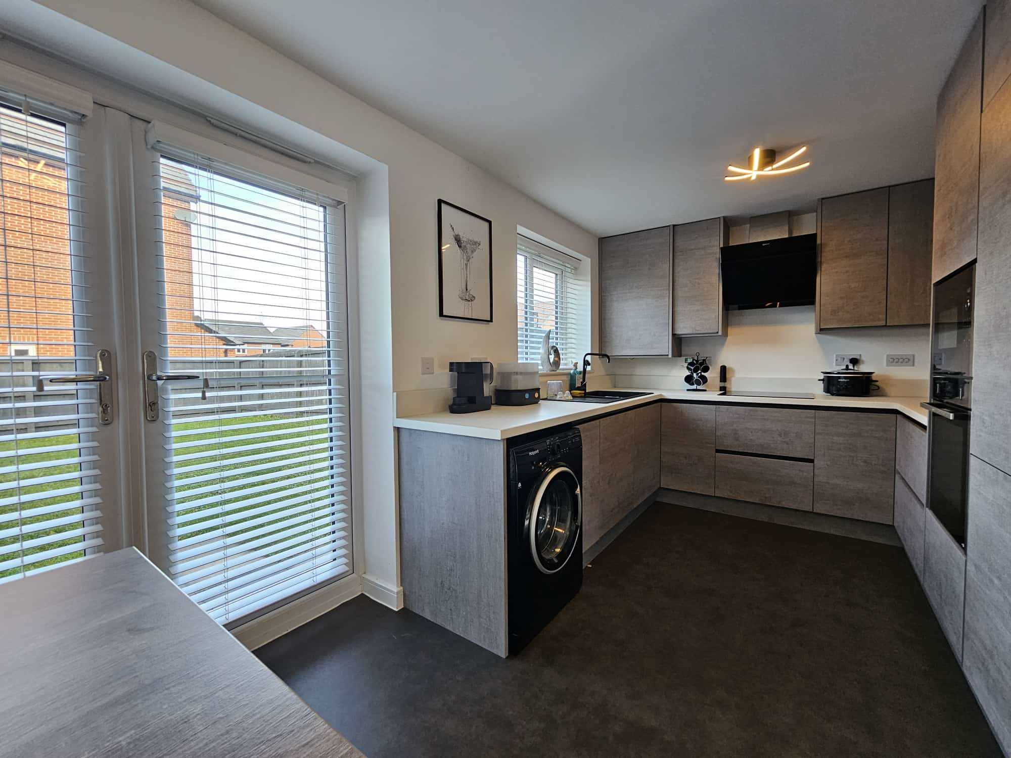 Upvc French doors and window to the rear of the property, Newly installed Kitchen with integrated double oven, induction hob, dish washer and fridge freezer also plumbed for washing machine and matching black sink and extractor, laminate flooring.