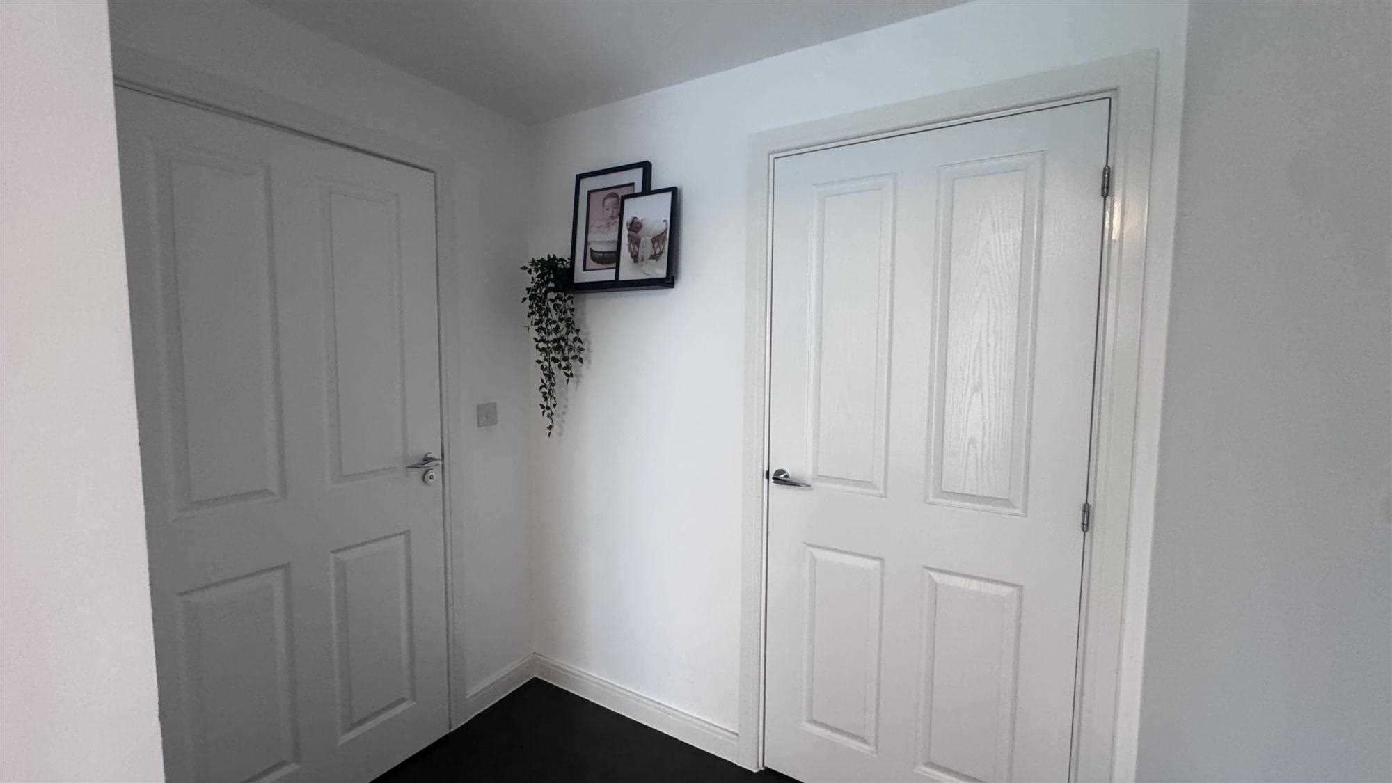 Composite enrance door, stairs to first floor, radiator and laminate flooring.