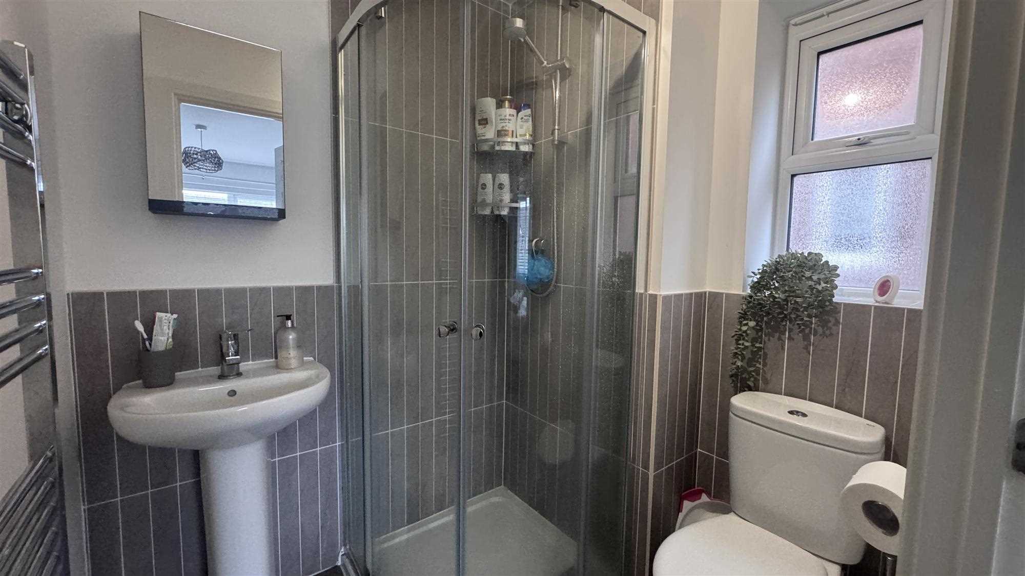 Upvc window to the front of the property, walk-in quadrant thermostatic controlled shower, low level Wc and pedestalled wash basin, heated towel radiator and part tiled walls, vinyl flooring.