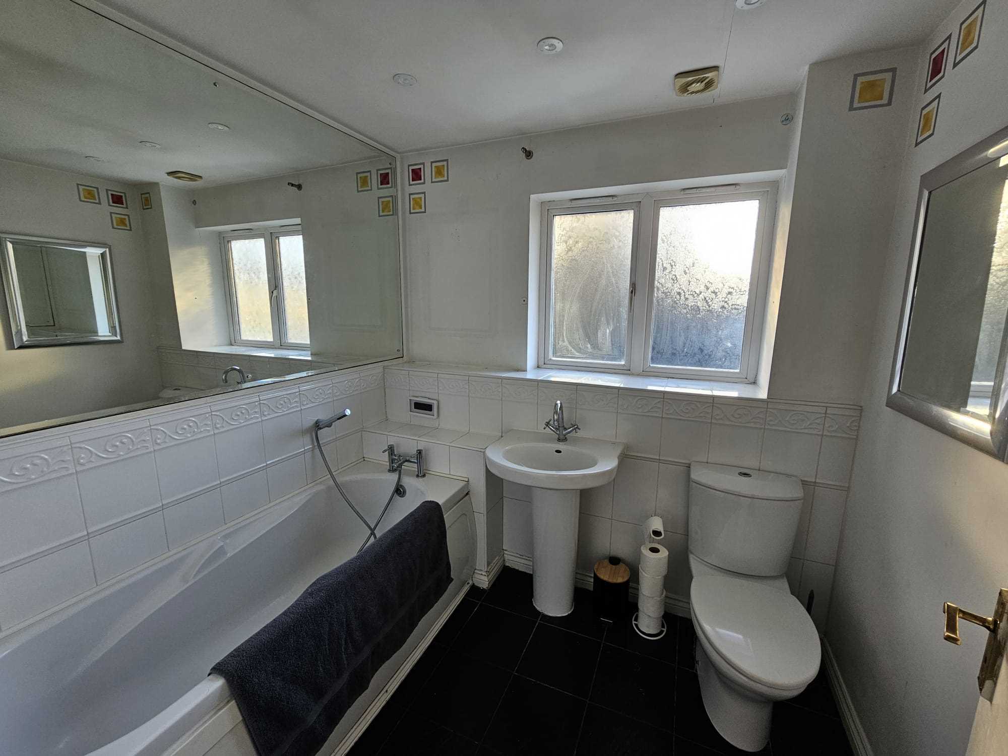 Upvc double glazed window, white panelled bath, low level WC, pedestal washbasin, part tiled walls, heated towel rail, tiled flooring, extractor fan and vinyl flooring.