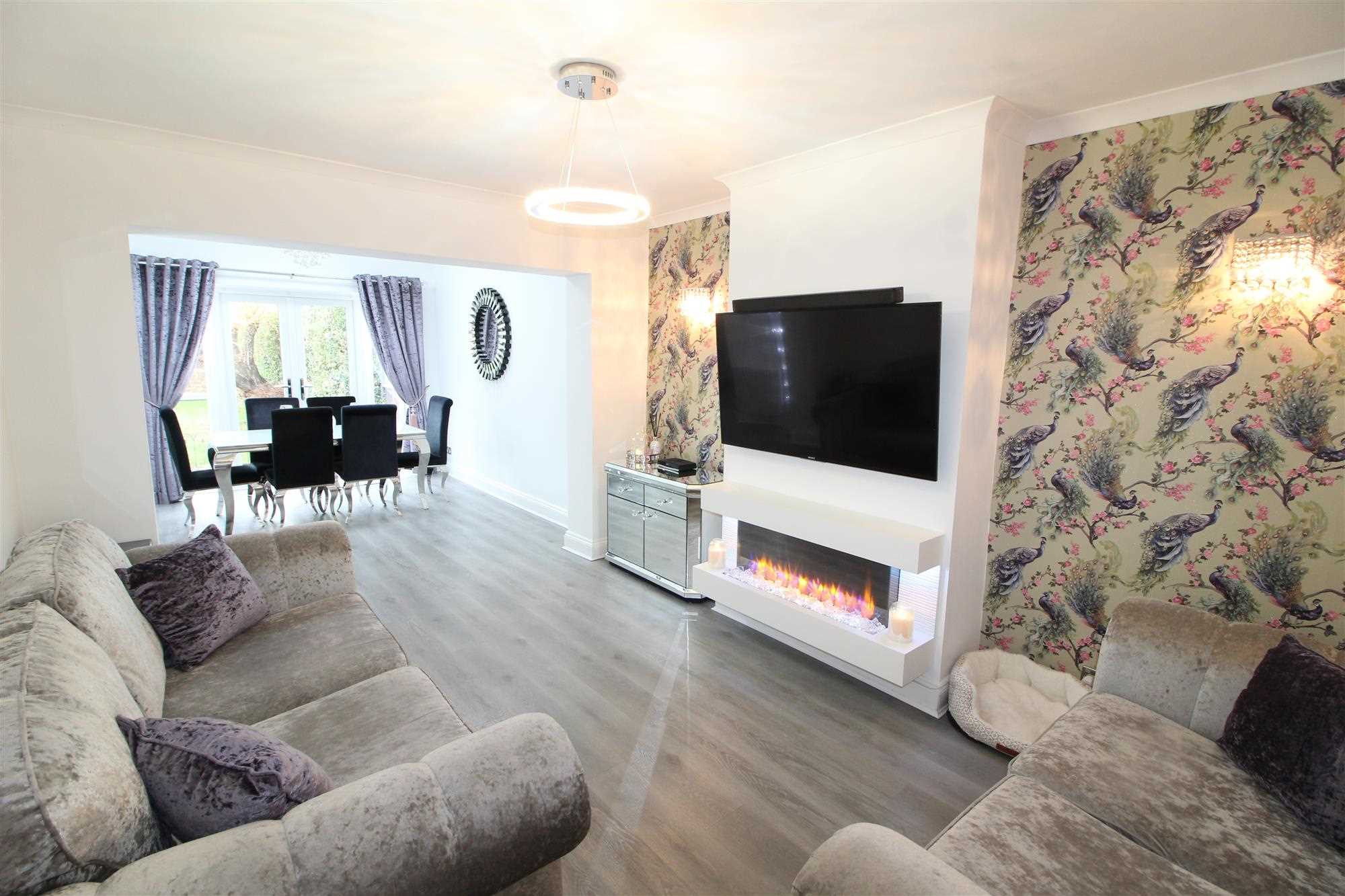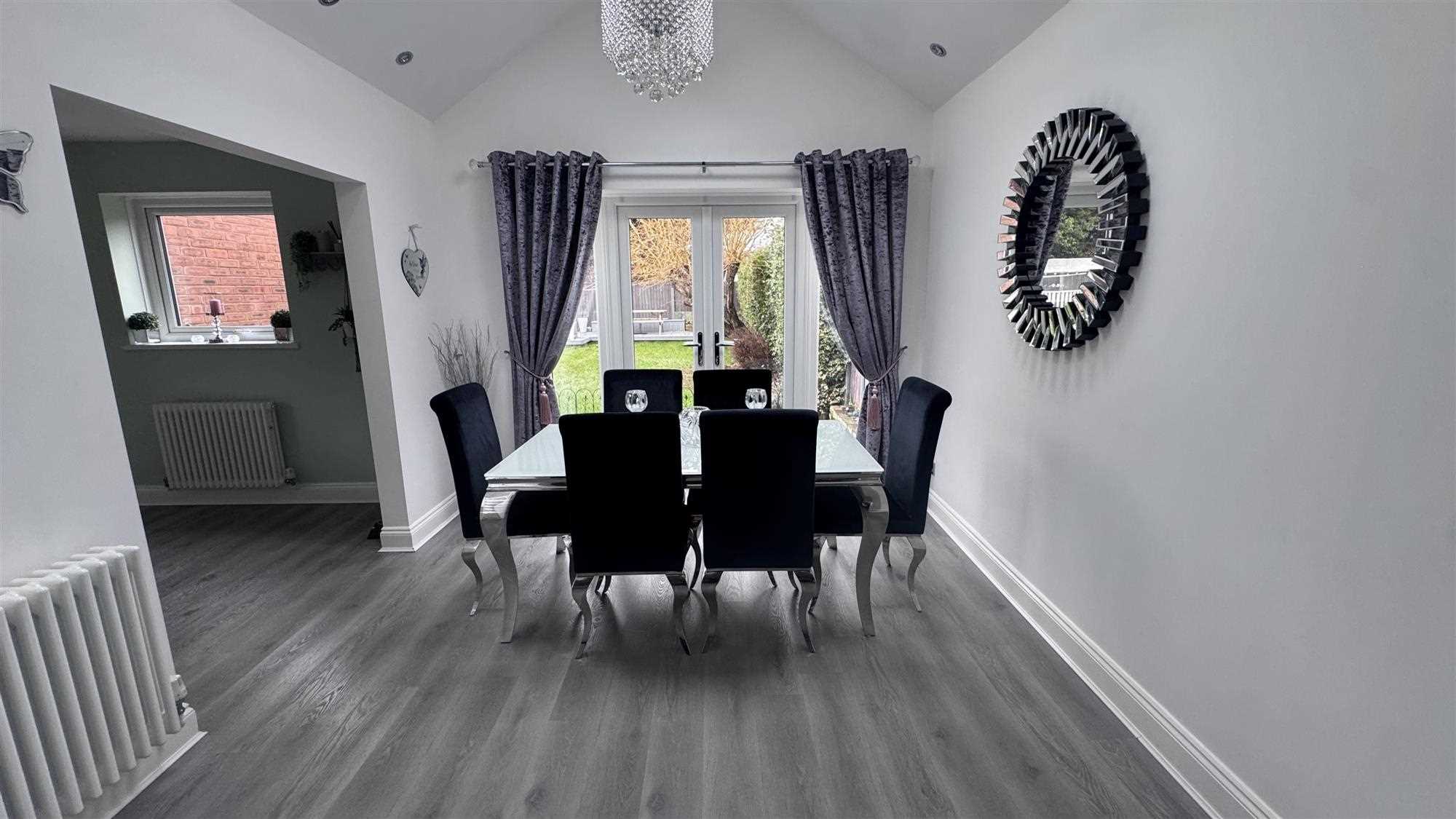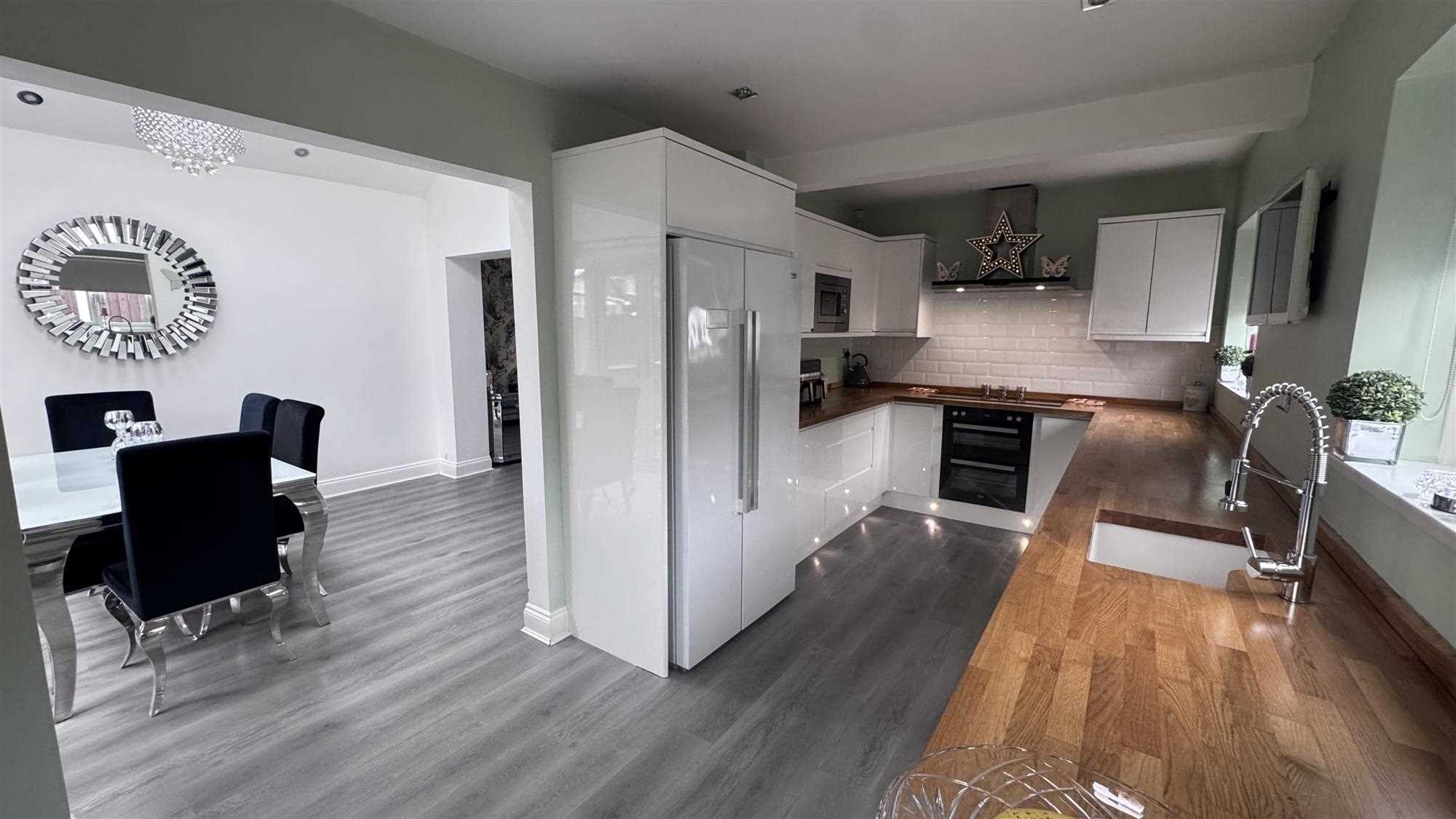 Two Upvc windows to the side of the property and another to the rear making this such a bright and airy room, White gloss base and wall units with built-in appliances such as integrated oven, hob, extractor and washing machine, contrasting wooden worktops make this quality kitchen stand out the laminate flooring runs throughout, there ai also an integral door to the garage.