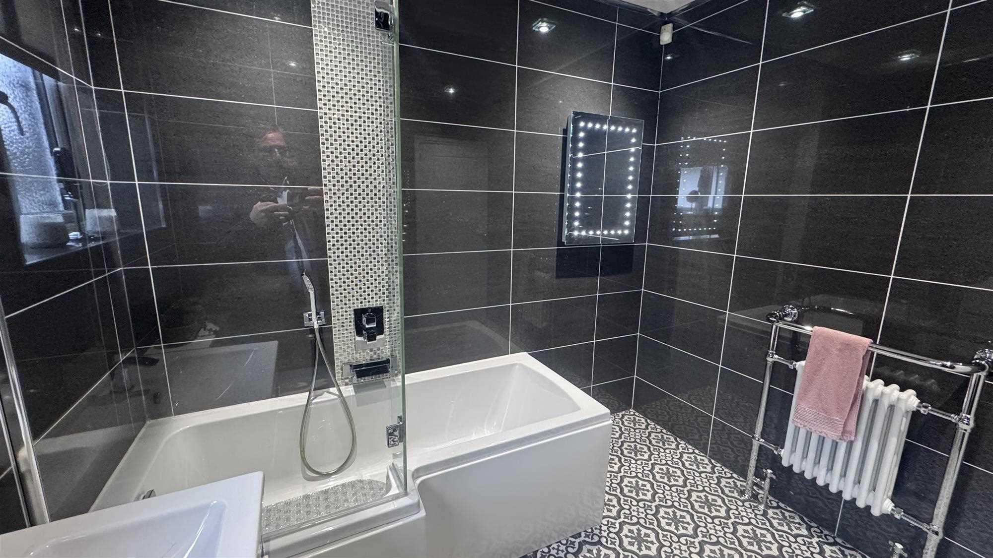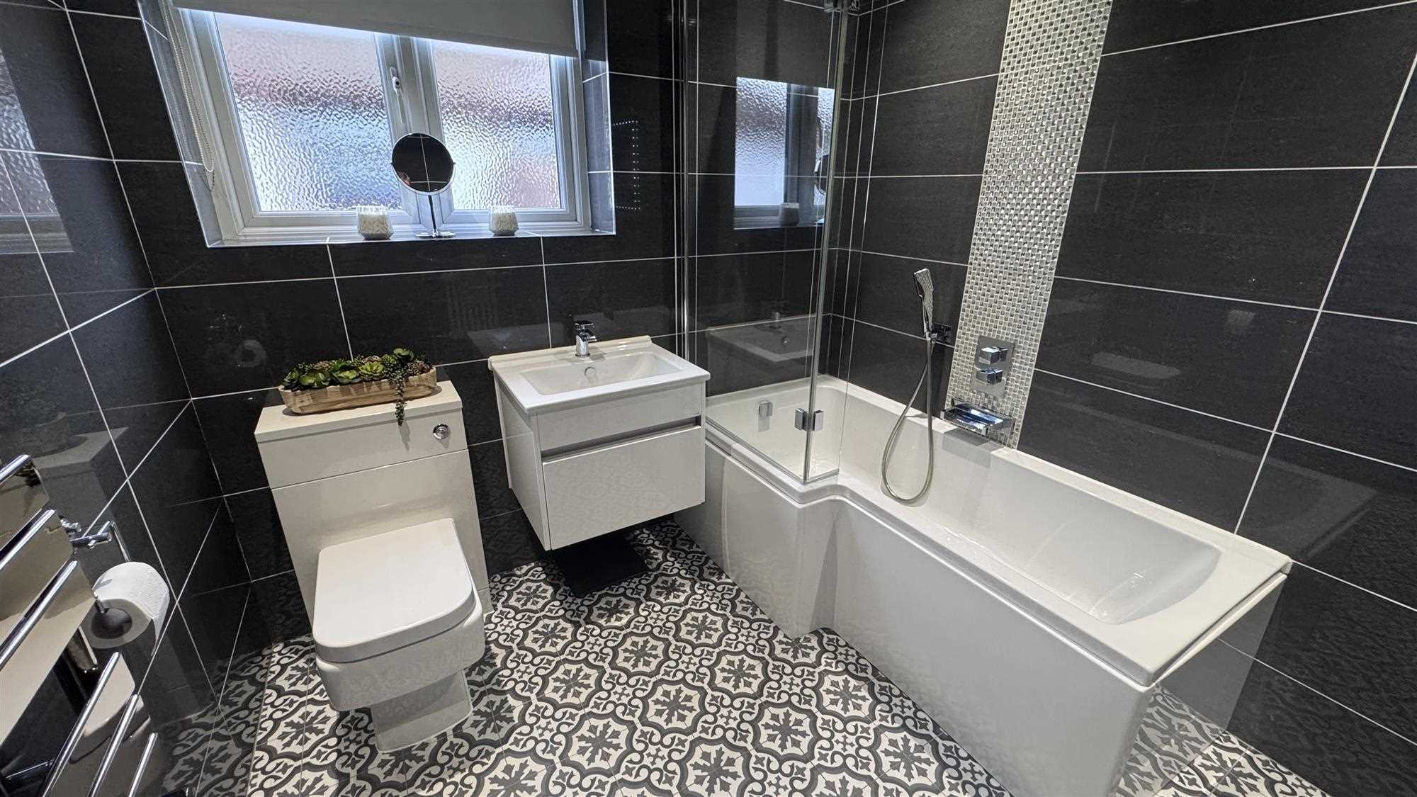 Upvc window to the side of the property, white bathroom suite consisting of "P" shaped panelled bath with overhead thermostatic shower and glass screen, low level Wc and wall hung wash basin with built-in vanity unit, heated towel radiator, spot lights and mechanical ventilation, ceramic flooring.