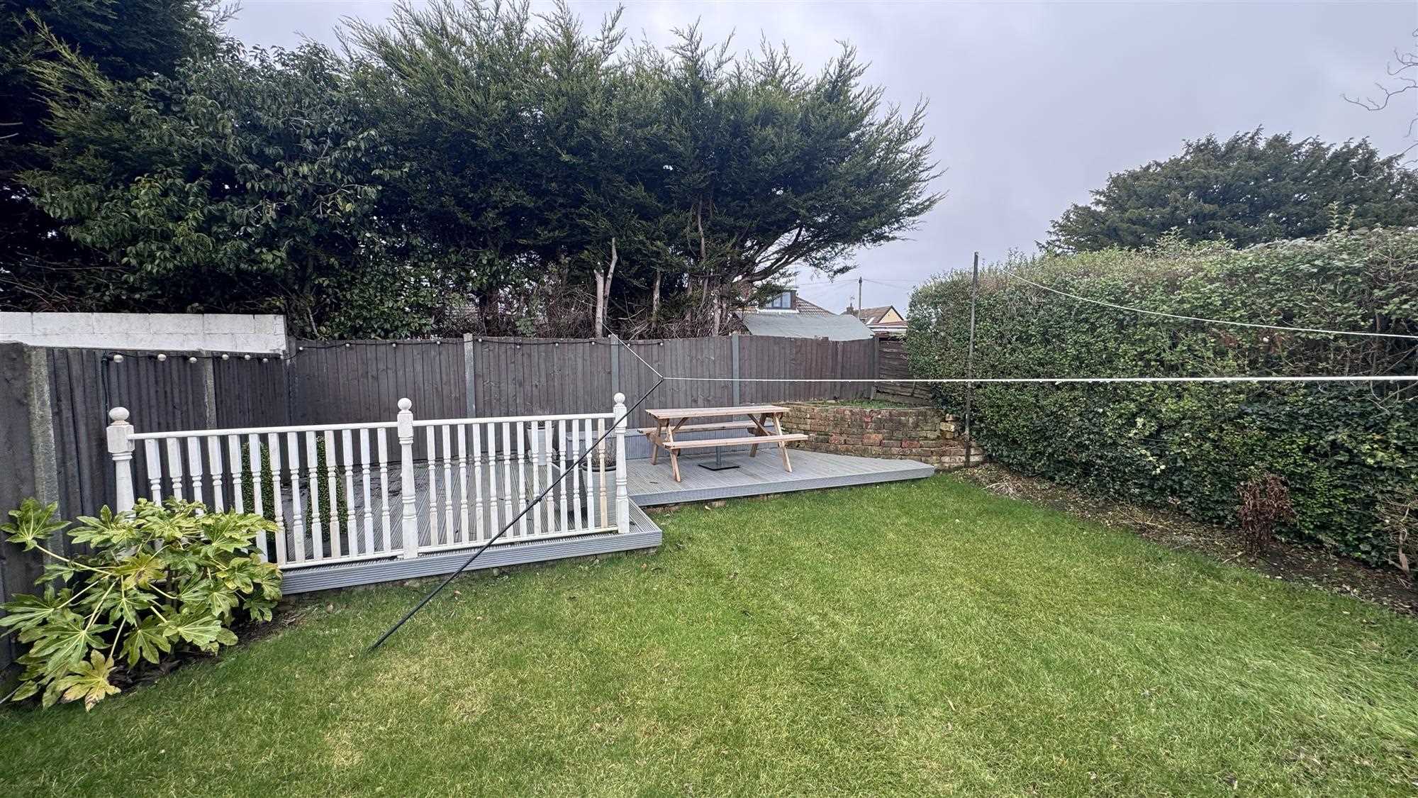 Paved patio with laid lawn, fenced boundaries.