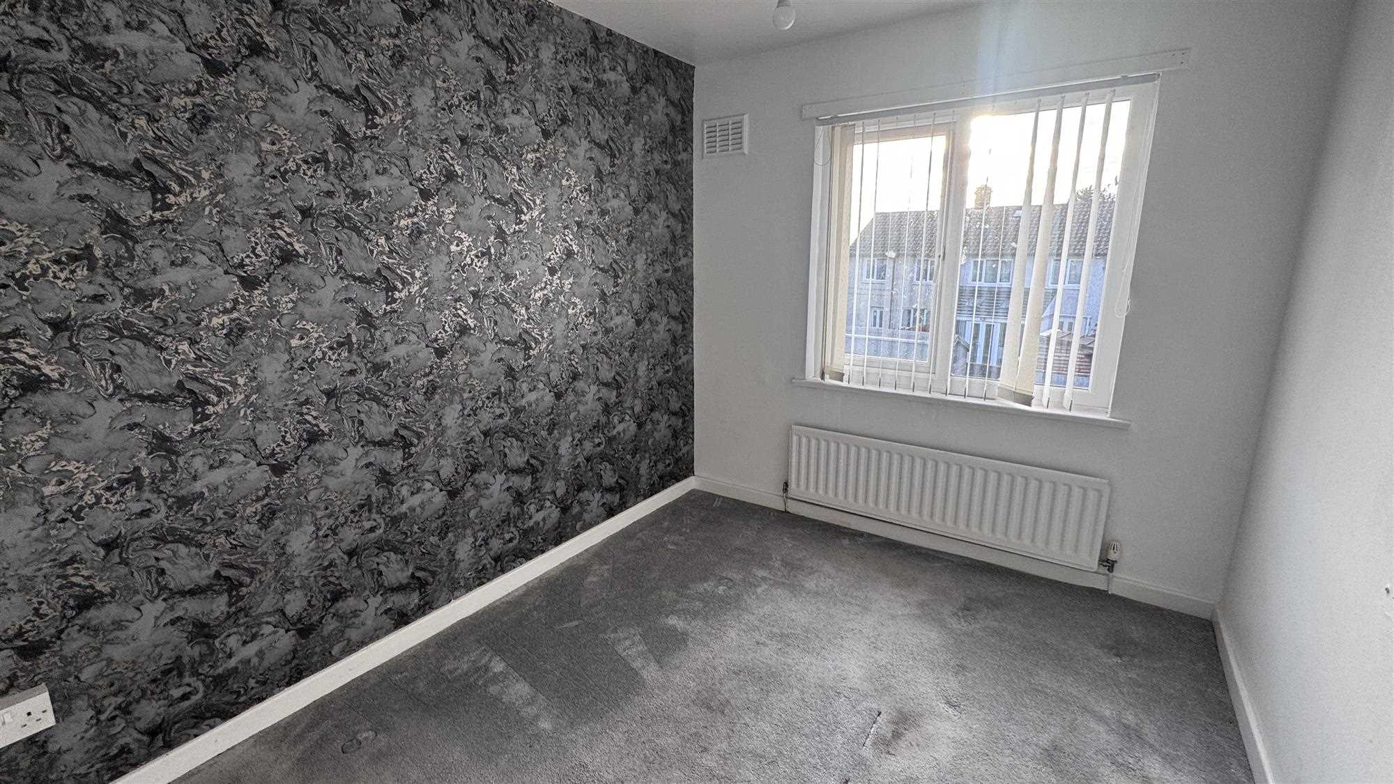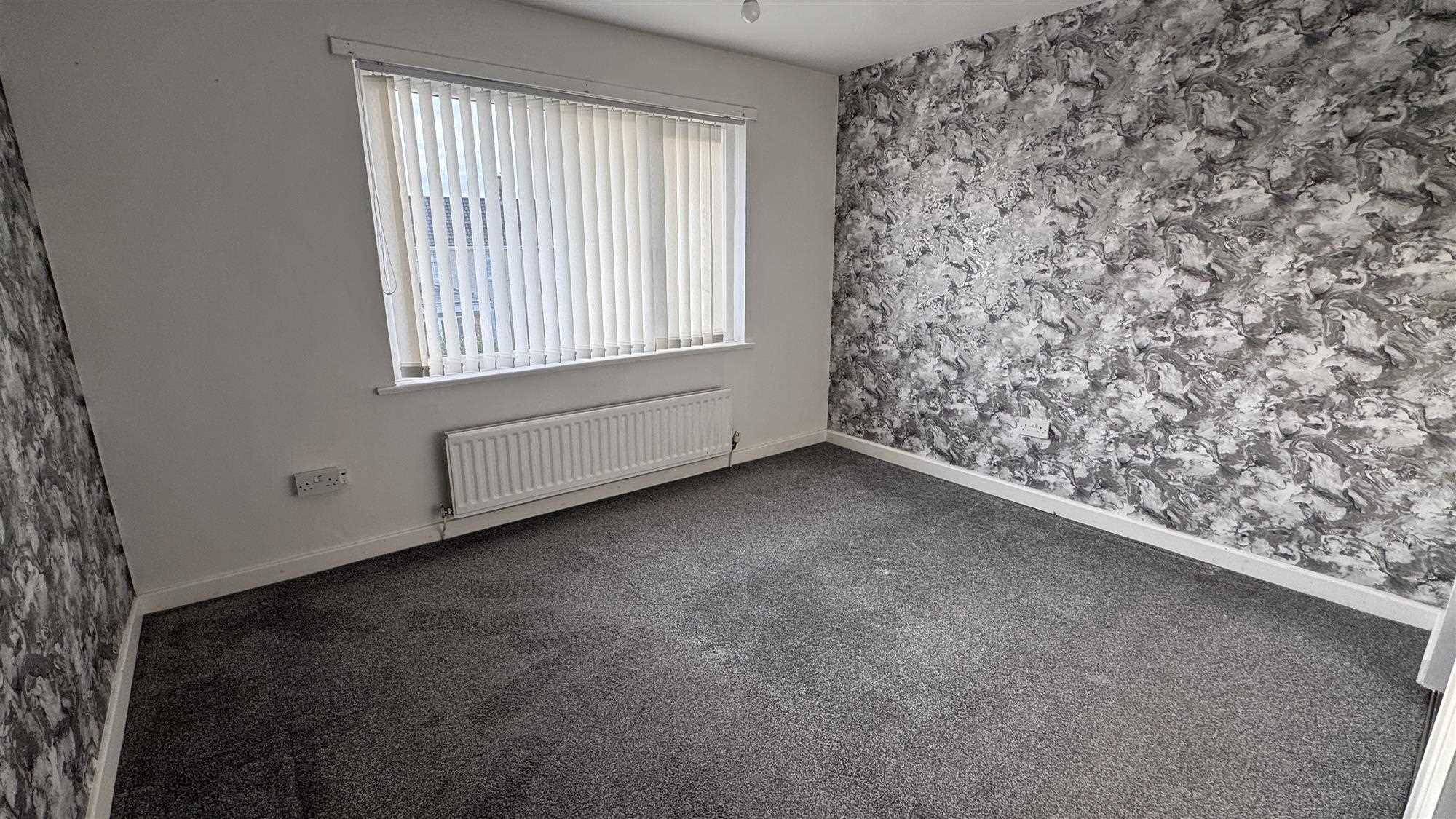 Upvc window to the rear of the property, radiator and carpeted flooring.