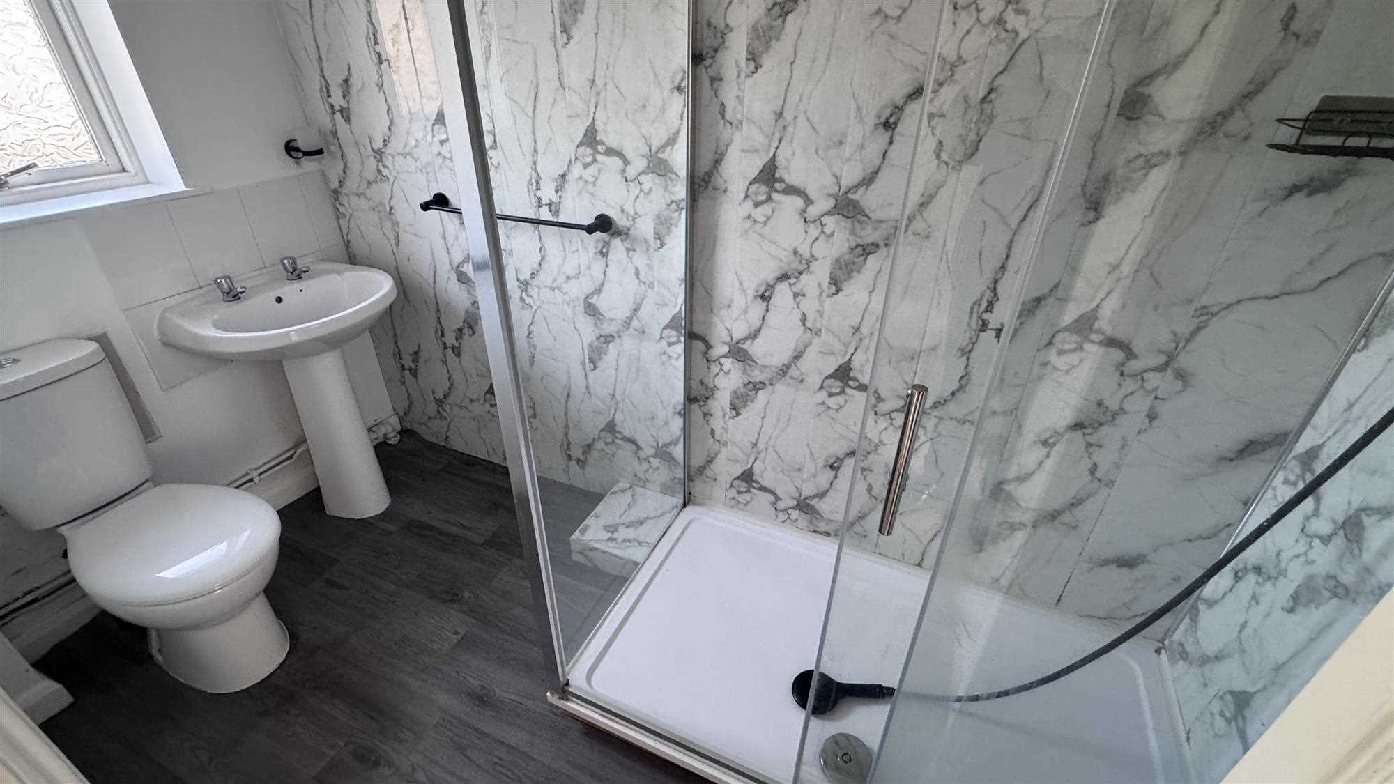 Window to the front of the property, large walk=in shower, low level Wc and pedestalled wash basin.